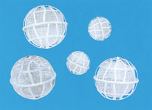 球形悬浮填料, 又称孔旋转球形悬浮填料 ,是对国内处理污水、生物膜法处理技术采用的多种填料中开发的系列产品。分内外双层球体,外部为网状球体,内部为旋转球体。