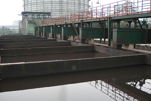 组合式斜板沉淀器有逆流和横流两种类型,用户可以根据不同情况加以选用。对于炼钢厂转炉烟气净化污水处理而言,由于污水悬浮物含量高,温度变化范围大,为消除因温度变化而产生的异重流影响,选用横流组合式斜板沉淀器较为理想。若采用由全自动干粉投加絮凝剂装置(电磁式凝聚器)-斜板沉淀器-螺旋输泥机-压缩空气提升-脱水机所组成的新工艺来处理上述污水,则经处理后的污水悬浮物含量可<30-100ml/l,污泥含水率<25~30%,是较为理想的水处理工艺和水处理设备。
