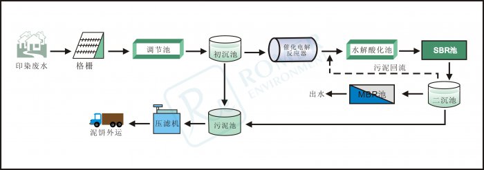 废水经过预处理,流入调节池进行均化水质水量,然后通过物理化学及微电解反应处理,降低悬浮物等;再进行生化处理,通过SBR工艺进一步降解有机污染物出水进至MBR膜生物反应器反应处理达到排放或回用的要求。