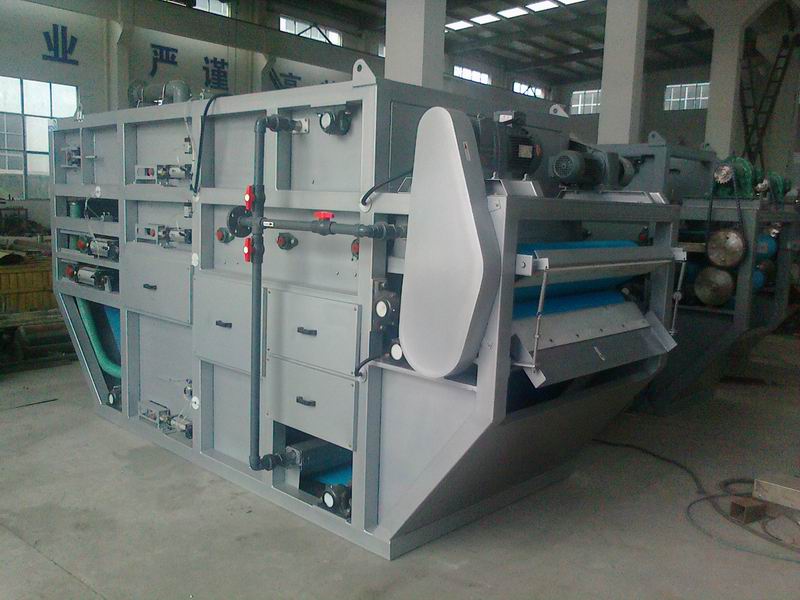 物料脱离楔形区就进入压力区,物料在此区内受挤压,沿滤带运行方向压力随挤压辊直径的减少而增加,物料受到挤压体积收缩,物料内的间隙游离水被挤出,此时,基本形成滤饼,继续向前至压力尾部的高压区经过高压后滤饼的含水量可降至最低。