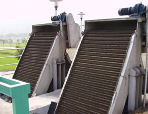 旋转式系列格栅除污机分为不锈钢网齿和非金属齿两种。在电机减速器的带动下,经链轮传动,驱动耙齿链,进行回转运动。当耙齿运转到设备上部时,由于导轮和弯轨的导向,使每组耙齿之间产生相对的运动。大部分固体物质靠重力落下,另一部分依靠转刷轴的反向运动,可以把粘在耙齿上的杂物洗刷干净。