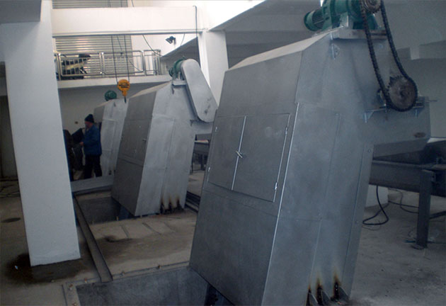 CF-Ⅰ型回转式固液分离机采用回转式,由一种特殊形状的犁形耙齿按一定的装配顺序和数量排列在横轴上,组成耙齿链,根据过水流量,装配成不同的间隙,安装在泵站或水处理系统的入口处,当驱动装置带动耙齿自下向上运动时,水中的杂物被耙齿捞起,液体则在栅隙中流过,设备转动到上部顶点后,耙齿链改变运动方向,由上向下运动,物料依靠自重从耙齿上自动脱落,当耙齿从反面转到设备底部时,又开始另一循环往复的连续运行,从而不断地从水中清捞杂物,达到固液分离的目的。