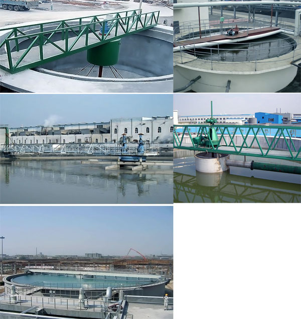 ZCG型中心传动刮泥机采用中心传动、悬挂式,污水从工作桥下进水管流入导流筒扩散后,均匀的向周边呈辐射状流出,呈悬浮状的污泥经沉淀后沉积于池底,驱动装置带动中心立轴旋转,并带动刮臂及刮泥板转动,将污泥从池周刮向中心集泥槽后,靠池内静水压由排泥管排出池外,水面上的浮渣通过旋转撇渣装置撇向池边,再由刮渣耙刮进排渣斗内排出池外;而上清液则通过三角形出水堰板溢入出水槽内排出。