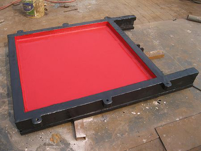 门框为铸铁闸门与基础之间的连接构件,相当于平面钢闸门的埋高部分。门框包括下部门框和上部导轨两部分。下部门框一般整体铸造加工,导轨可用螺栓(螺钉)与门框相接,或与下部门框整体铸造,在门体开启到最高位置时,导轨的顶端应高于门体的水平中心线。